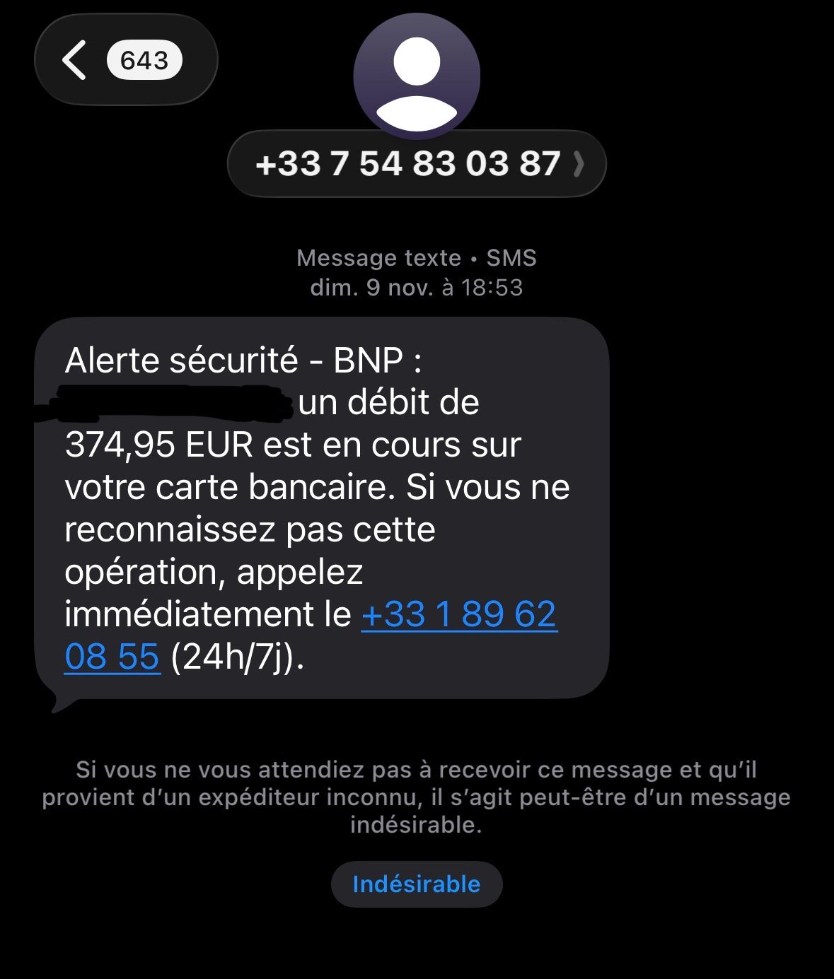 Faux message de la BNP qui me dis que j'ai un débit de 374,95€ en cours et me demande d'appeler un autre numéro (01 89 62 08 55) pur régler le problème