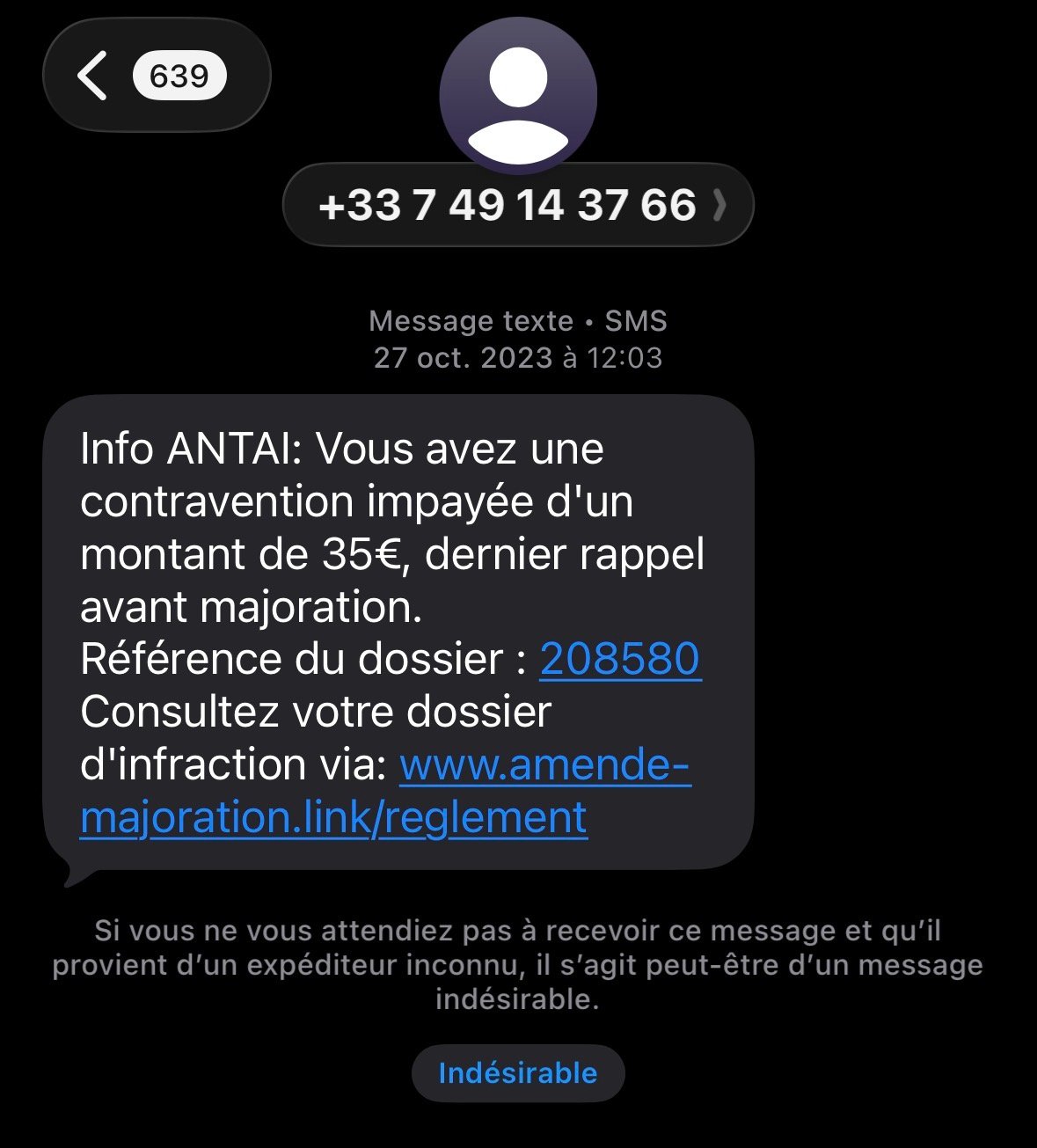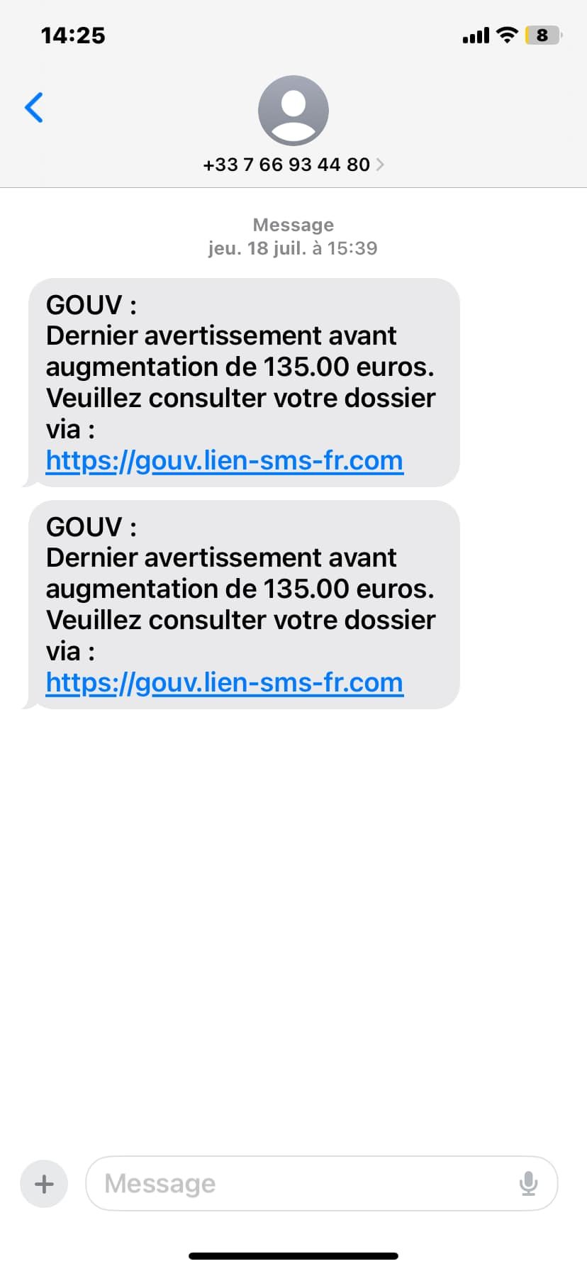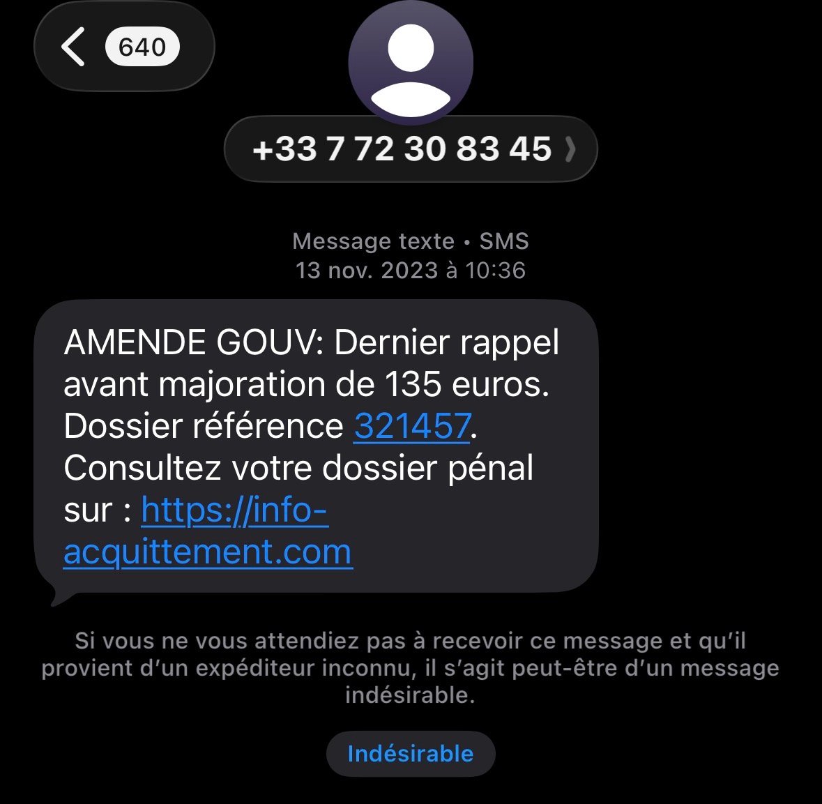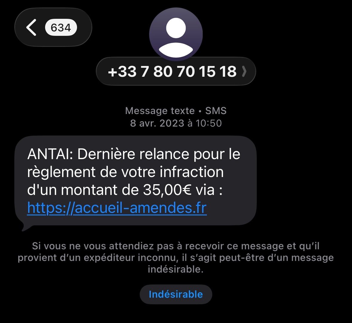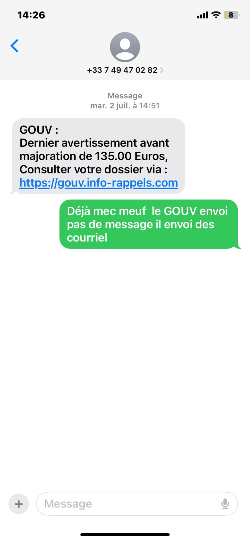 Message pour une prétendue amende qui n'existe pas, ce n'est pas un site de l'état et en plus ça provient d'un numéro portable
