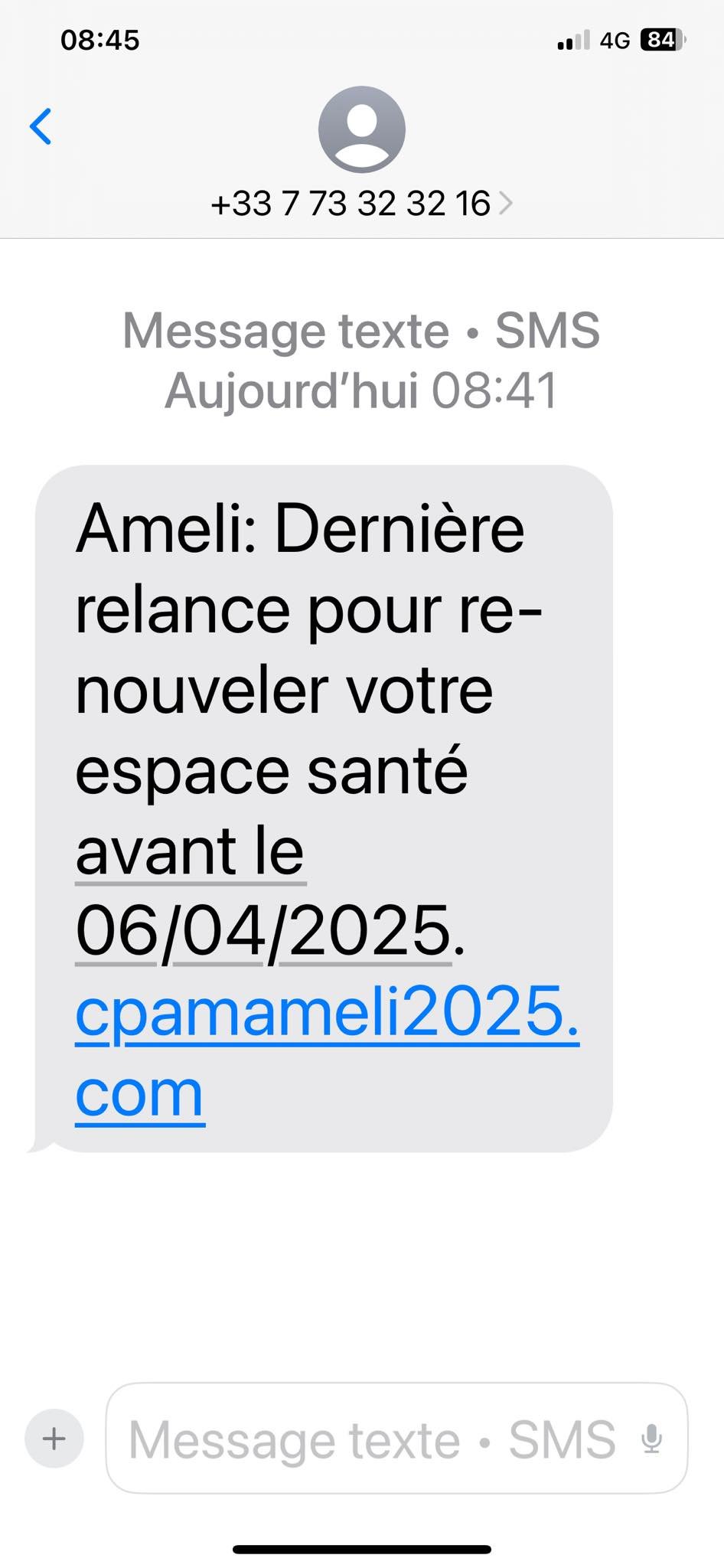 Arnaque pour renouvellement espace santé CPAM (faux lien et date incohérente)